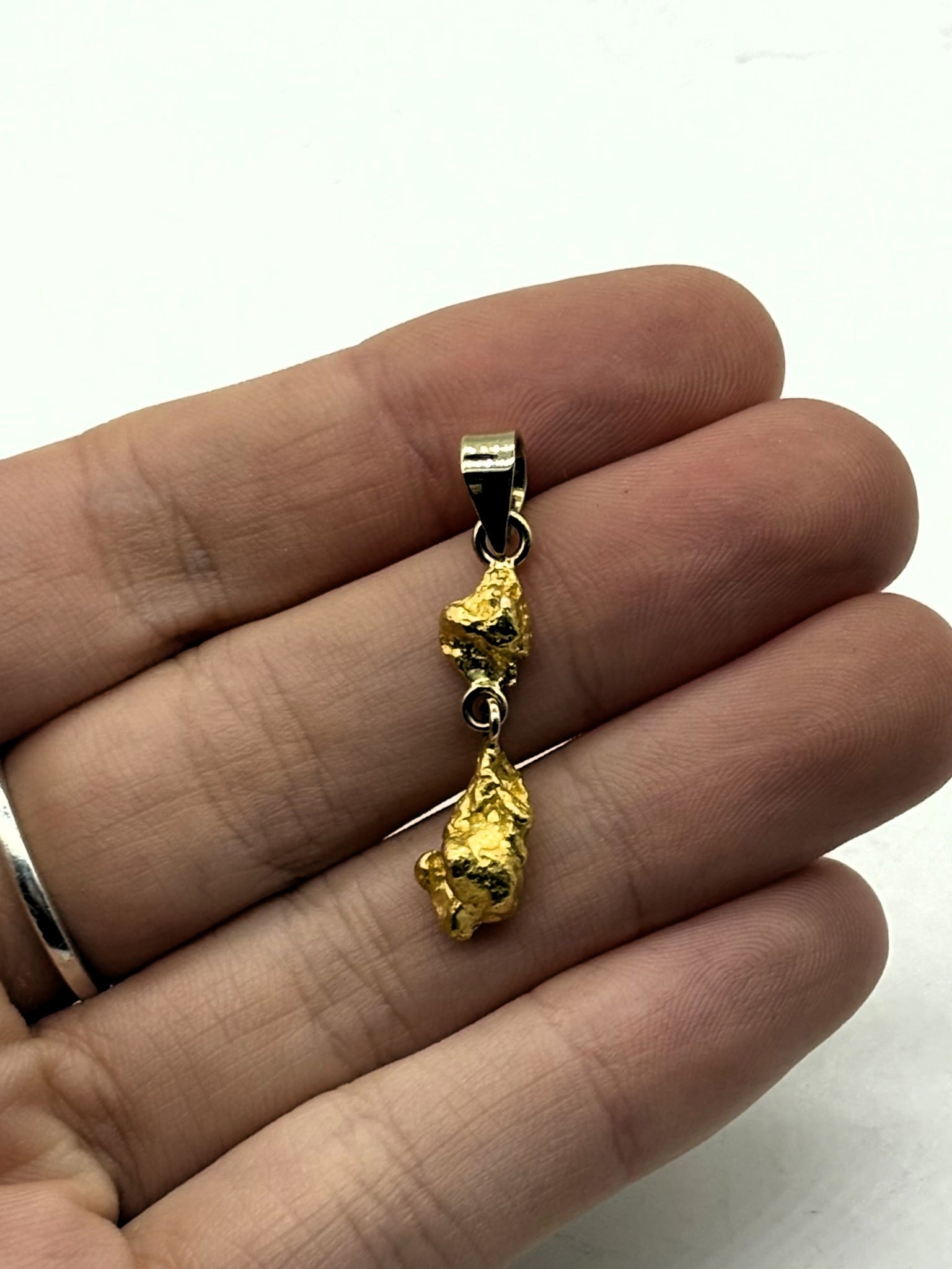 This pendant features x2 high purity gold nuggets , 9ct yellow gold bail & findings. The nuggets were sourced from the Kalgoorlie region goldfields of Western Australia by a local prospector using a metal detector. Gold nuggets from this area typically assay between 92 and 98% pure gold. All of our gold nugget jewellery is assembled in Western Australia.